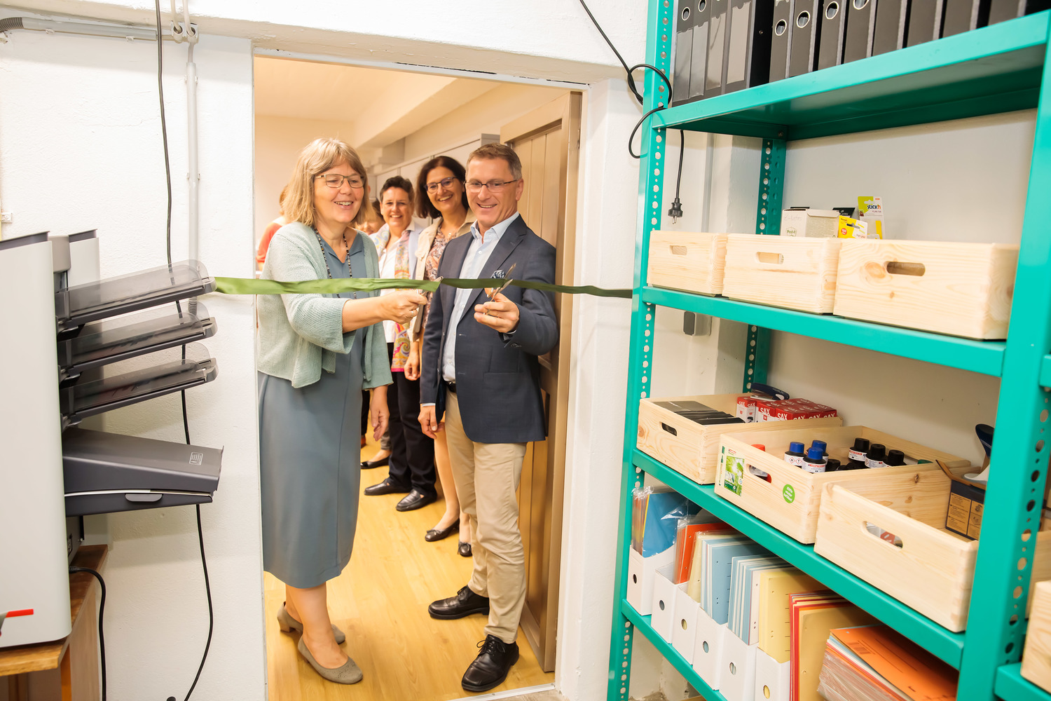 Umweltbeauftragte Hemma Opis-Pieber dankte dem „Team Pro Schöpfung“, das lange an der Umsetzung getüftelt hatte. Eine kleine Gruppe von vier Kolleginnen wird sich in Zukunft um den reibungslosen Ablauf kümmern. Wirtschaftsdirektor Andreas Ehart bezeichnete die Materialstelle als „kleinen Puzzlestein zur Rettung der Welt“ und unterstützt das Anliegen mit der großzügigen Übernahme der Kosten. Gemeinsam wurde dann ein „grünes Band“ durchgeschnitten und die Materialstelle ihrer Bestimmung übergeben. Schon im sommerlichen Probelauf war das Interesse und die Freude der Kolleg:innen groß.