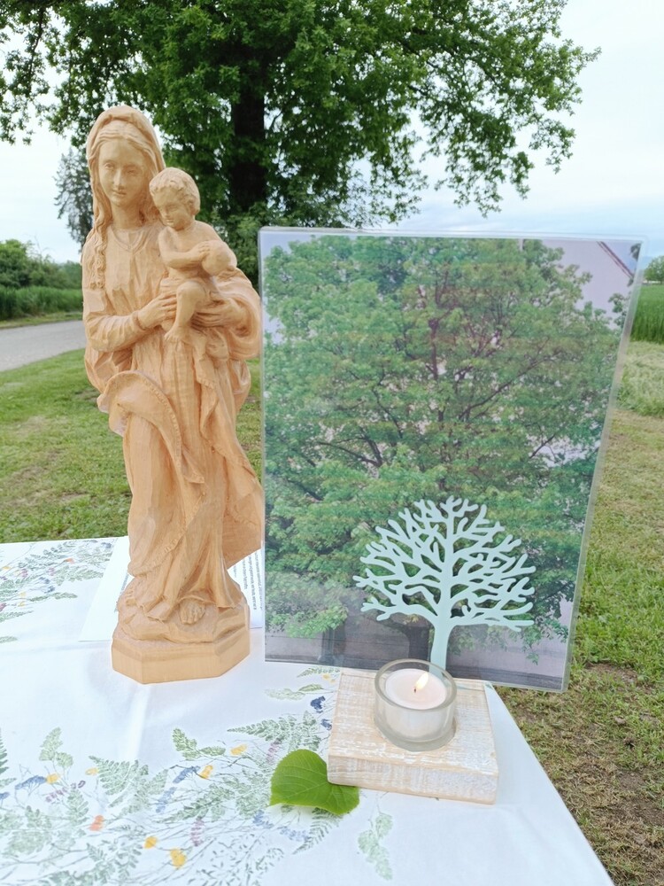 Besonders schön ist dieser Platz, weil er von großen und alten Bäumen umgeben ist. In dieser Andacht baute ich eine Brücke von der Linde, die mein Geburtstagsbaum und die Pflanze des Jahres 2025 ist, und Maria, die fest verwurzelt im Vertrauen zu Gott die Schätze des Himmels empfängt, und Gott sichtbar und spürbar in unsere Lebenswelt hineinträgt.