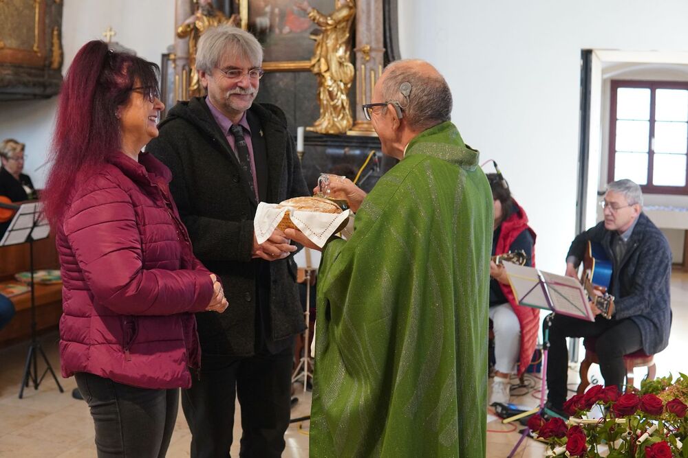 Dazu kamen als Besonderheit dieses Sonntags Glück- und Segenswünsche für unseren Diakon Michi Zepf, der genau an diesem Tag seinen 60. Geburtstag feierte. Ernst Pock, Vorsitzender des PGR, gratulierte herzlich und überreichte ein für Michi „zugeschnitztes“ Geschenk. Dass er den Segen Gottes bis in die Zehenspitzen spüren möge, wünschten ihm schließlich die Sängerinnen und Sänger des Kirchenchores in ihrem Segenslied!