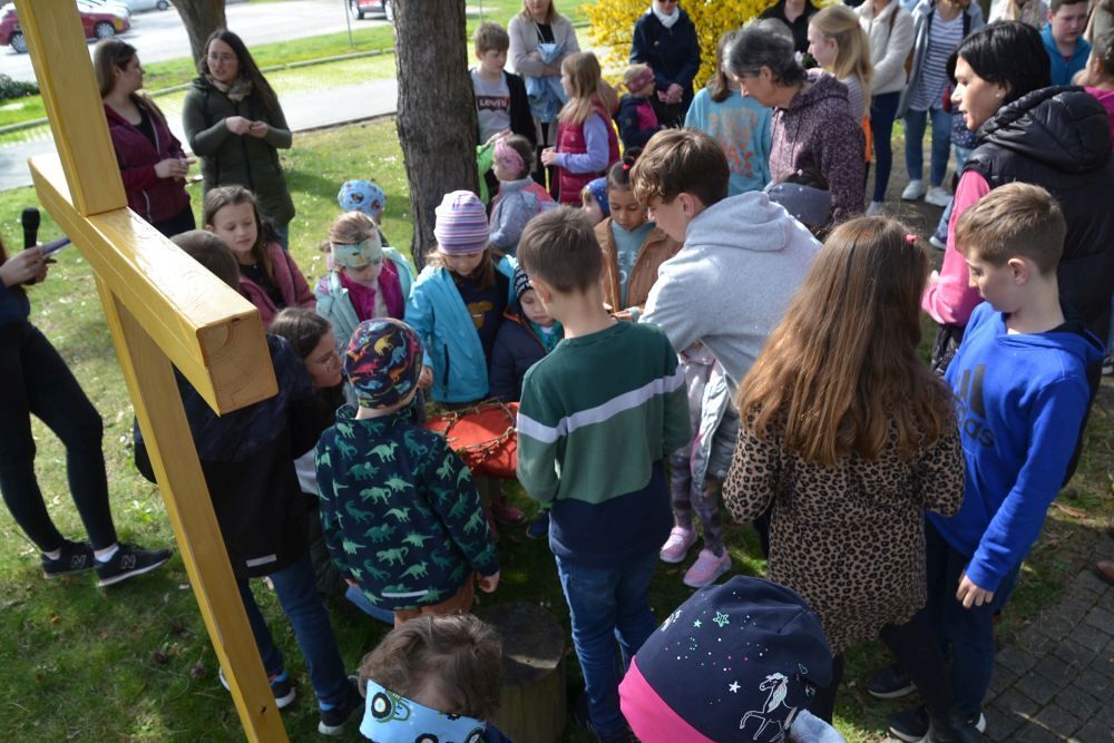 Jedes Kind durfte ein eigenes kleines Holzkreuz den gesamten Kreuzweg selbst mittragen. Bei jeder der fünf Stationen konnten die Kinder ihr Schlüsselanhänger-Kreuz kreativ aufwerten. Dafür wurden passend zur Geschichte rund um Jesus und Ostern die vier Jungscharfarben Rot, Gelb, Grün und Blau miteingearbeitet. Der Grundgedanke des Kinderkreuzwegs war es, die Kinder selbst Jesus sein zu lassen. Dies konnte mit Hilfe der verschiedenen Sinne erlebt werden. Abschließend durften die Kinder passend zur Auferstehung das Holzkreuz mit frischen Blumen bekleben und Kresse, als Symbol des Lebens, säen.
